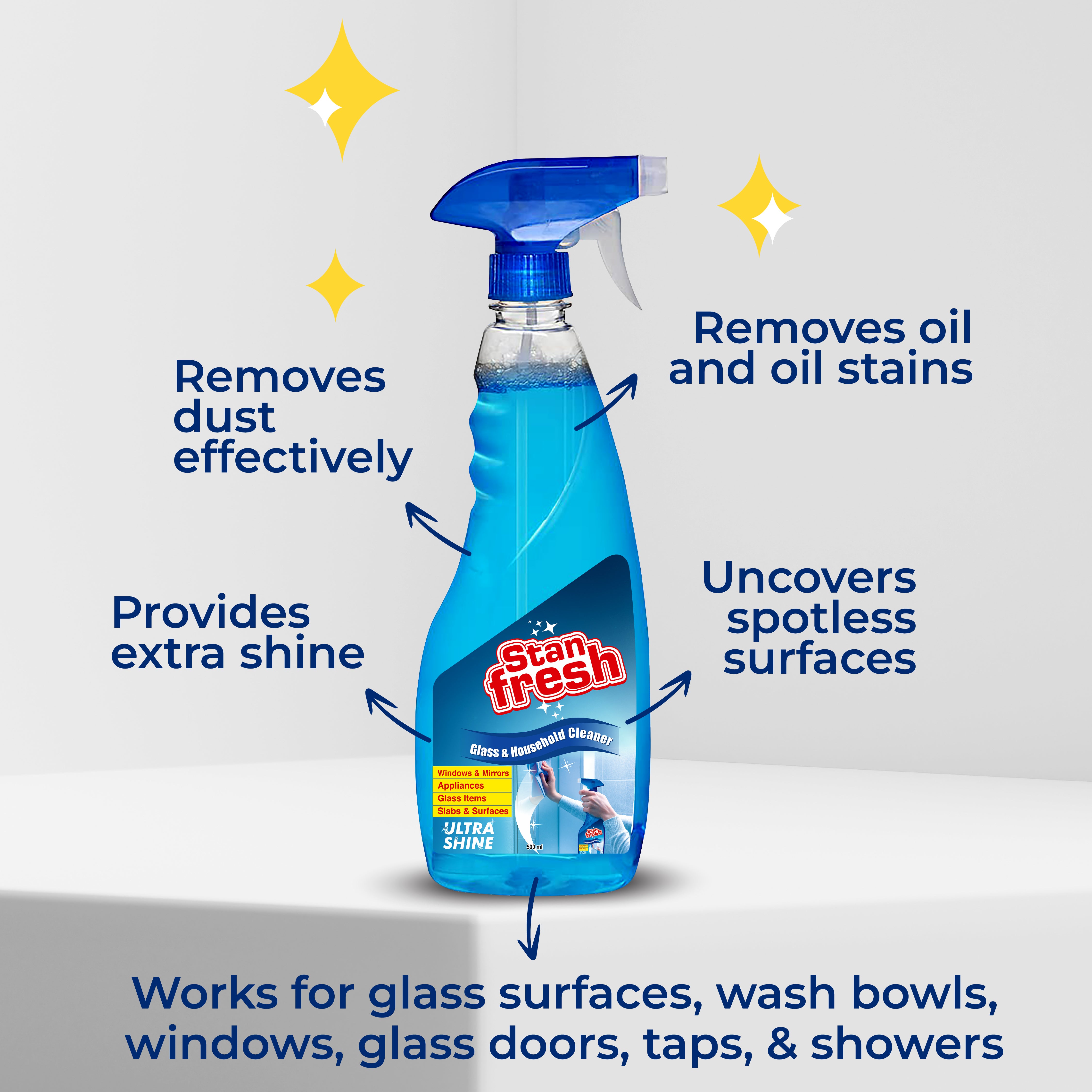 - Bring the Shine with Stanfresh Glass & Household Cleaner – Spray on glass or any other surfaces and wipe with a dry microfiber cloth for a streak-free finish.